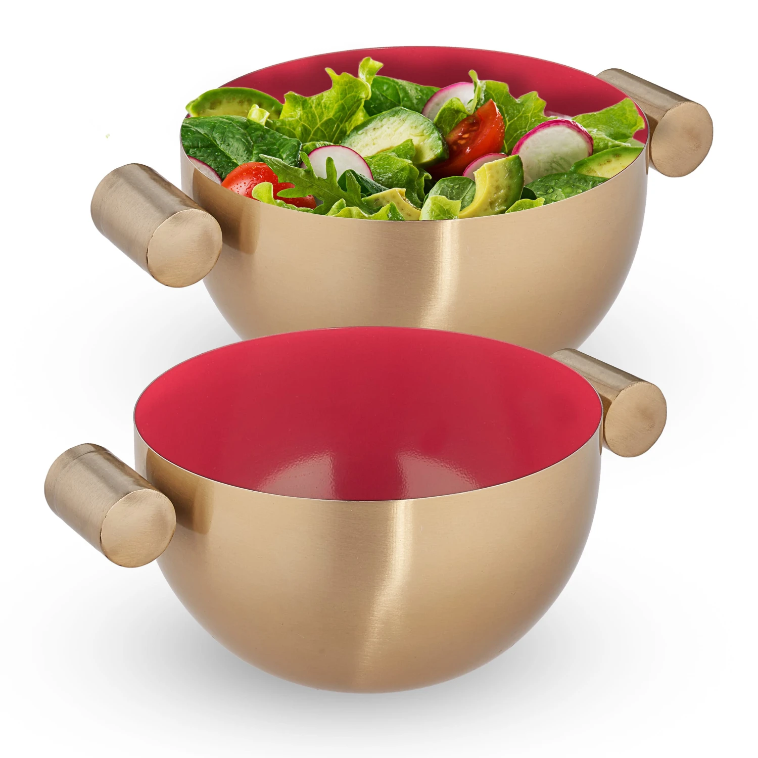 Mit dieser edlen Metallschüssel servierst Du Salate, Chips und andere Snacks besonders dekorativ. Das elegante, rot-goldene Design der Salatschüssel ist dabei ein Blickfang auf jeder gedeckten Tafel. Aber nicht nur als Servierschale, sondern auch als Rührschüssel zum Zubereiten von Teig beim Backen ist die Kochschüssel wunderbar geeignet. Die Schüssel besteht aus langlebigem Edelstahl und kann nach dem Gebrauch unter fließendem Wasser schnell und einfach gereinigt werden.