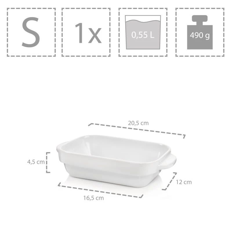 1x Auflaufform S - LxBxH: 20,5x12x4,5 cm – Füllmenge: 0,55 L – Gewicht: 490 g