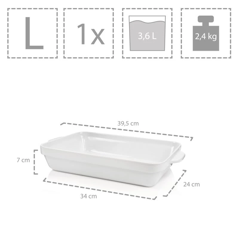 1x Auflaufform L - LxBxH: 39,5x24x7 cm – Füllmenge: 3,5 L – Gewicht: 2,4 kg