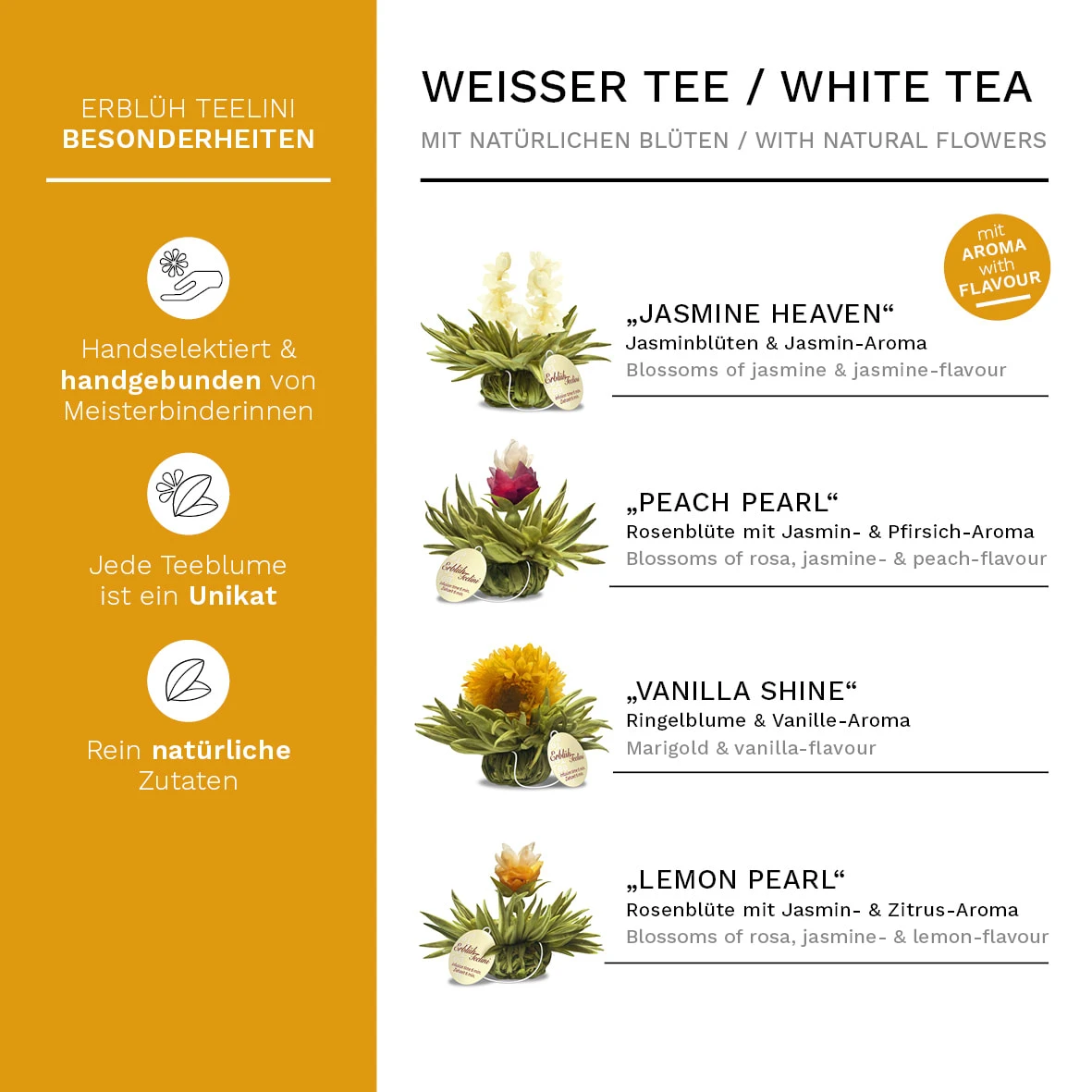 Weißer Tee (min. 95%); Blüten (1-5%) von Ringelblume, Rose (Damascena), Jasmin, Rose (Centifolia), Aroma (Vanille, Jasmin, Zitrone, Pfirsich)