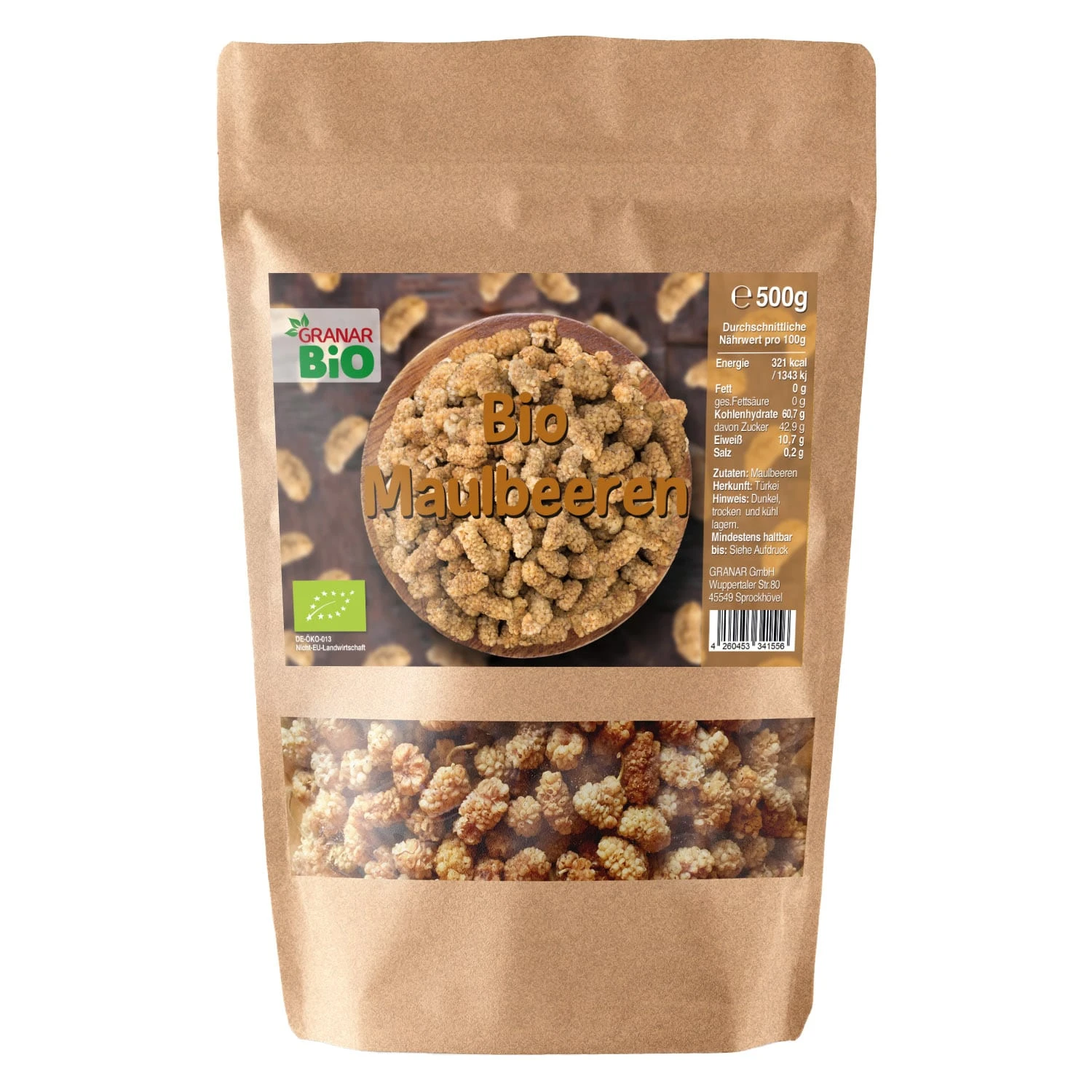 Die getrockneten Maulbeeren von Granar Bio stammen aus der sonnenreichen Türkei und sind aus kontrolliert biologischemem Anbau. Maulbeeren gehören zu den ältesten Kulturpflanzen und wurden im 11. Jahrhundert nach Europa gebracht. Sie haben einen süßen Geschmack mit einer feinen Honignote. Die getrockneten Maulbeeren haben nur eine geringe Feuchte, deshalb schmecken sie auch besonders süß – absolut geeignet für den morgendlichen Müsli!