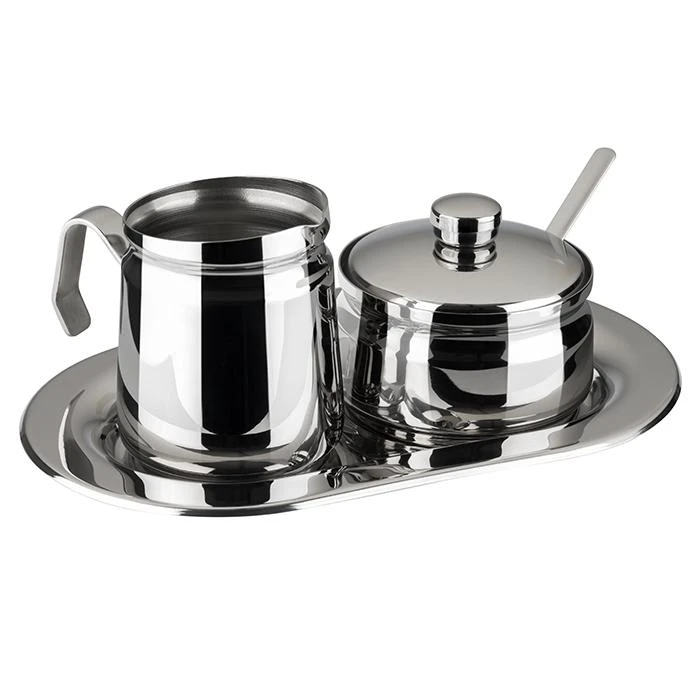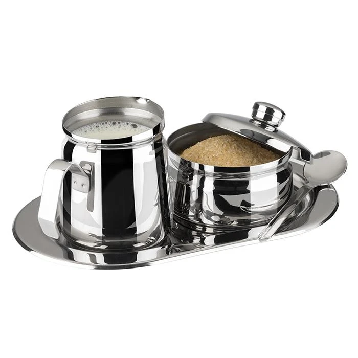 Dieses edle Milch- und Zuckerset aus Edelstahl verschönert jeden Frühstückstisch. Auch beim nachmittäglichen Kuchengenuss darf dieses Set nicht fehlen. Milch und Zucker werden in einem hygienischen Edelstahlbehältnis dem Kunden geschmackvoll präsentiert.