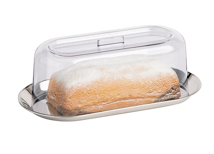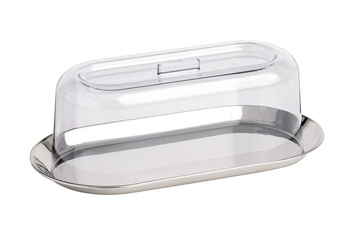 30 x 15,5 cm, H: 10,5 cm Set besteht aus: – Tablett aus Edelstahl30 x 15,5 cm, H: 1,5 cm hochglanzpoliert – Haube aus SAN25 x 12 cm, H: 10 cm