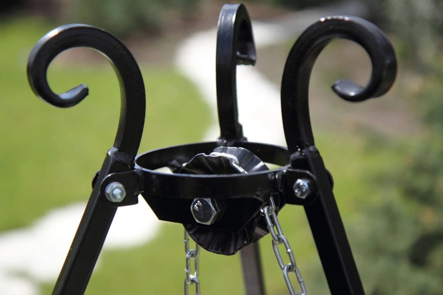 Das attraktive und praktische Dreibein-Gestell ist mit geschmiedeten Verzierungen versehen und wurde mit einer Pulverbeschichtung vor Witterungseinflüssen geschützt.