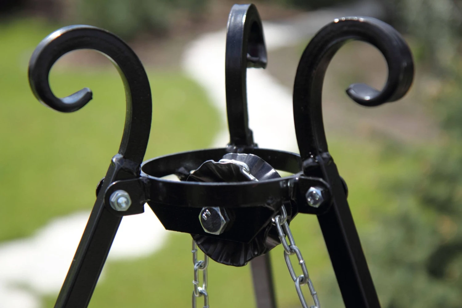 Das attraktive und praktische Dreibein-Gestell ist mit geschmiedeten Verzierungen versehen