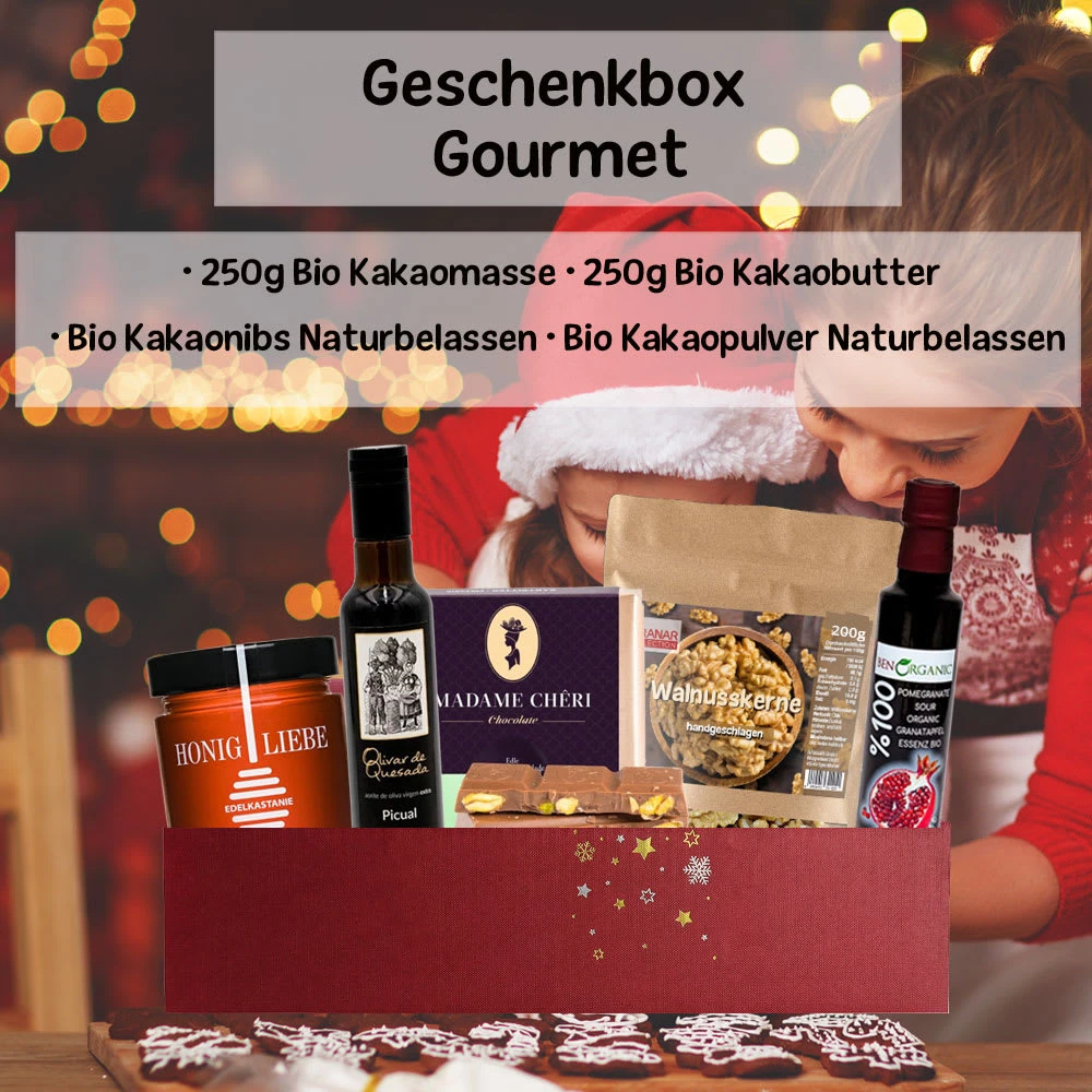 Die Geschenkbox „Gourmet“ besteht aus vier exklusiven Bio Kakao-Produkten für Ihre Weihnachtsbäckerei.