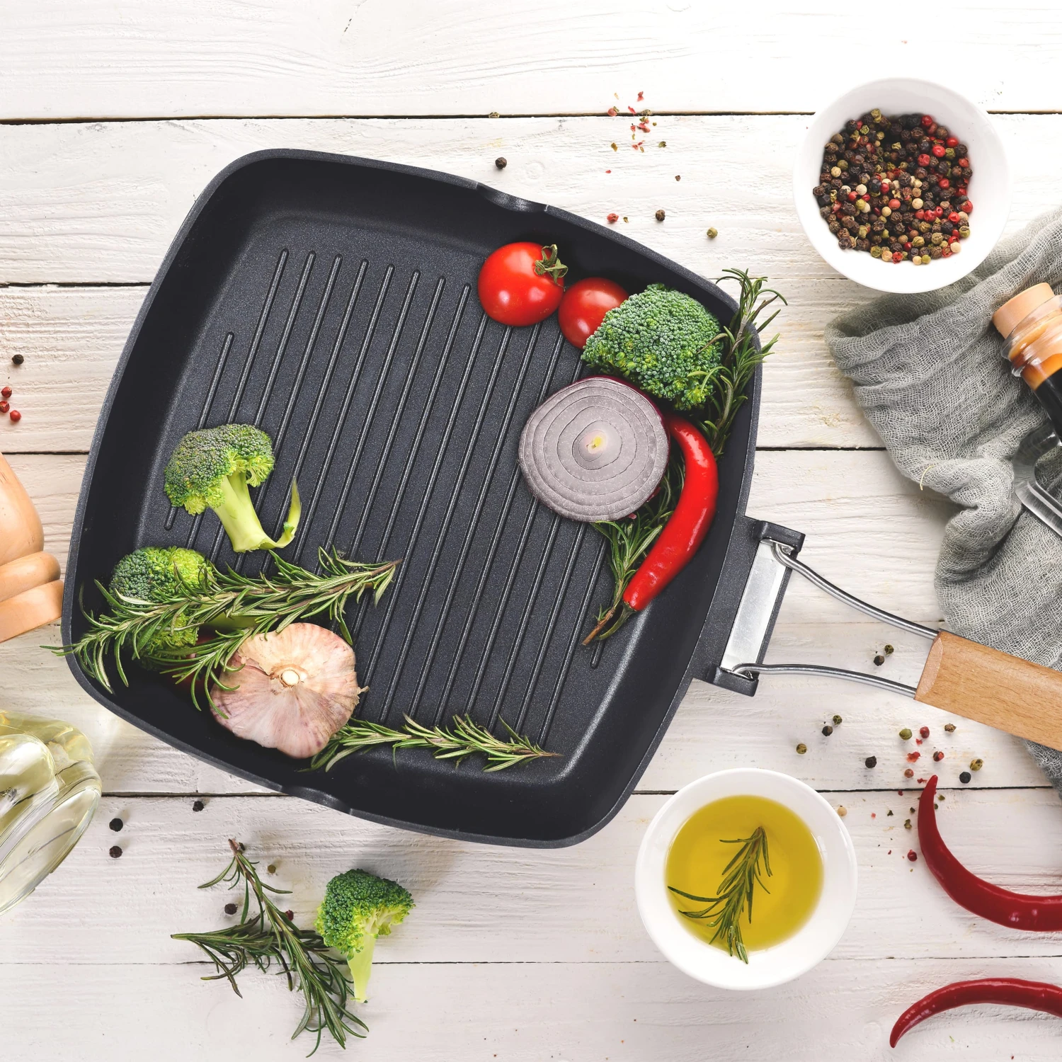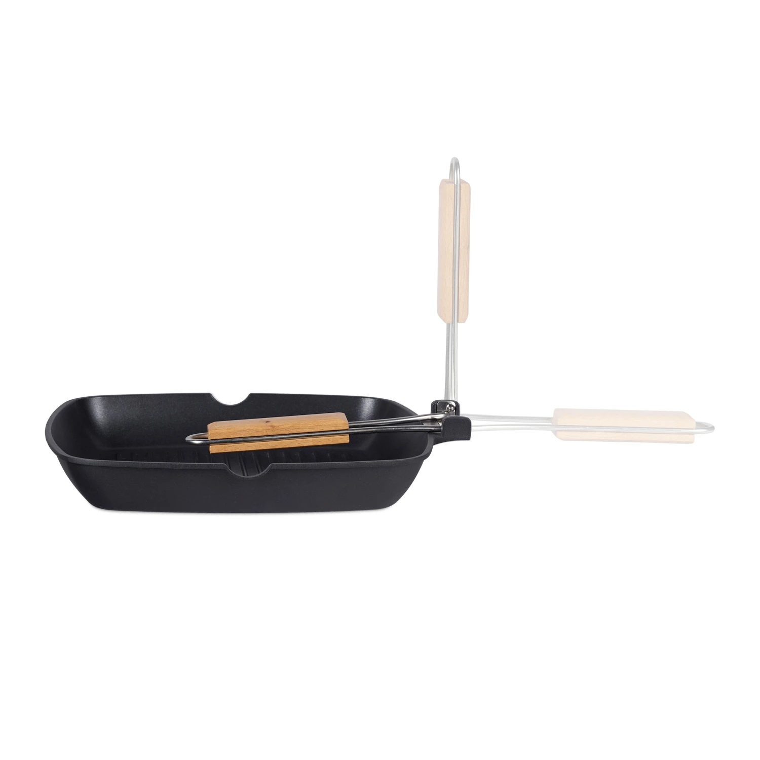 Mit der Grillpfanne braten Sie auch außerhalb der Grillsaison saftige Steaks, Bratwürste und Fisch oder knackige Gemüsespieße auf dem heimischen Herd. Dank der Rillenstruktur läuft überschüssiges Fett vom Grillgut ab und Sie können Ihre Speisen gesund und fettarm zubereiten. Durch die Antihaftbeschichtung geht die Reinigung der Induktionspfanne besonders leicht. Den praktischen Holzgriff können Sie zum Verstauen der Pfanne platzsparend einklappen oder die Grillplatte daran griffbereit aufhängen.