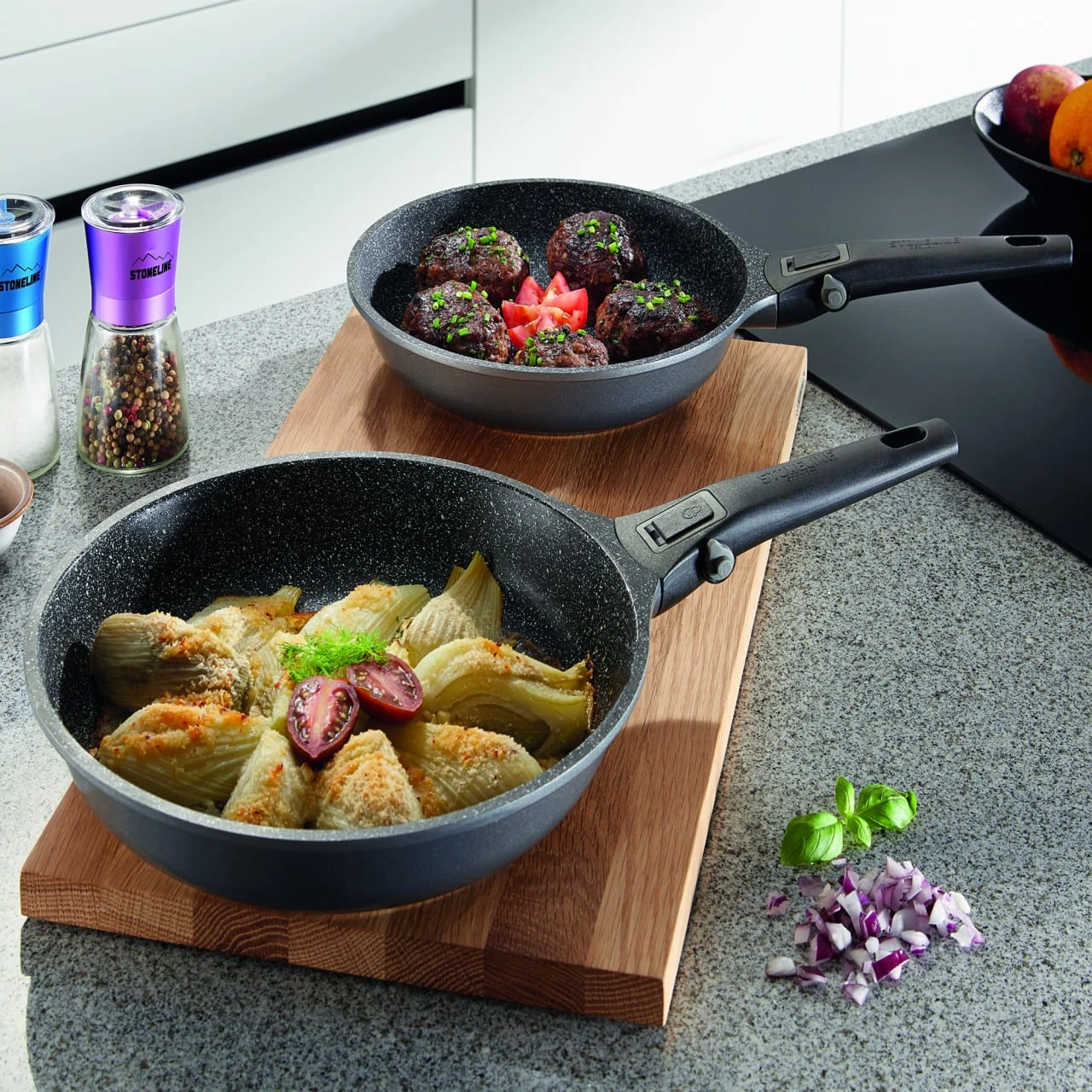 Zaubern Sie knusprige Bratkartoffeln, leckeres Gemüse, luftige Eierspeisen und kross gebratenes Fleisch und verwenden Sie dazu, je nach Bedarf, die kleinere oder die größere Pfanne!