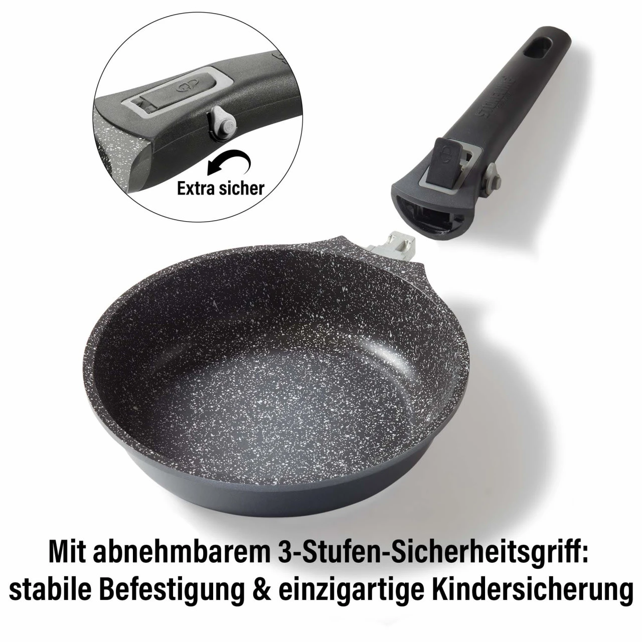 Der 3-Stufen-Sicherheitsgriff gewährleistet eine stabile Befestigung am Kochgeschirr und gewährleistet eine einzigartige Kindersicherung!