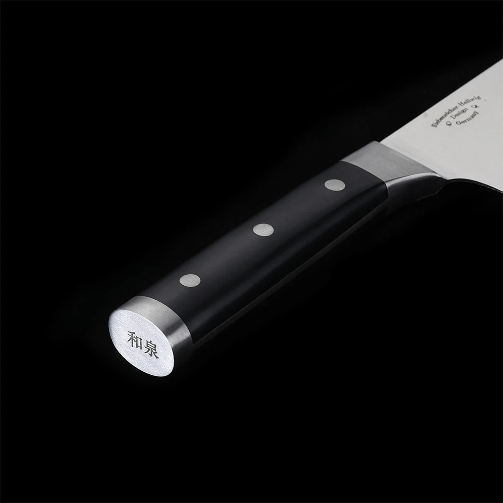 Neben dem hohen Gebrauchswert bestechen die Messer durch ihre zeitlose Eleganz. Der edle schwarze Griff ergänzt sich optisch hervorragend mit dem matten Finish der großen Edelstahlnieten und des Griffabschlusses.