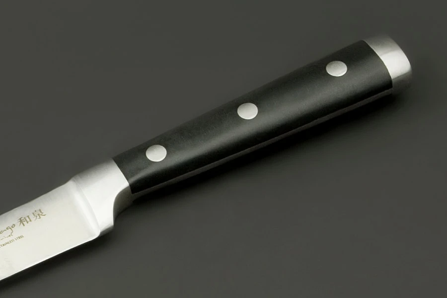 Neben dem hohen Gebrauchswert bestechen die Messer durch ihre zeitlose Eleganz. Der edle schwarze Griff ergänzt sich optisch hervorragend mit dem matten Finish der großen Edelstahlnieten und des Griffabschlusses.