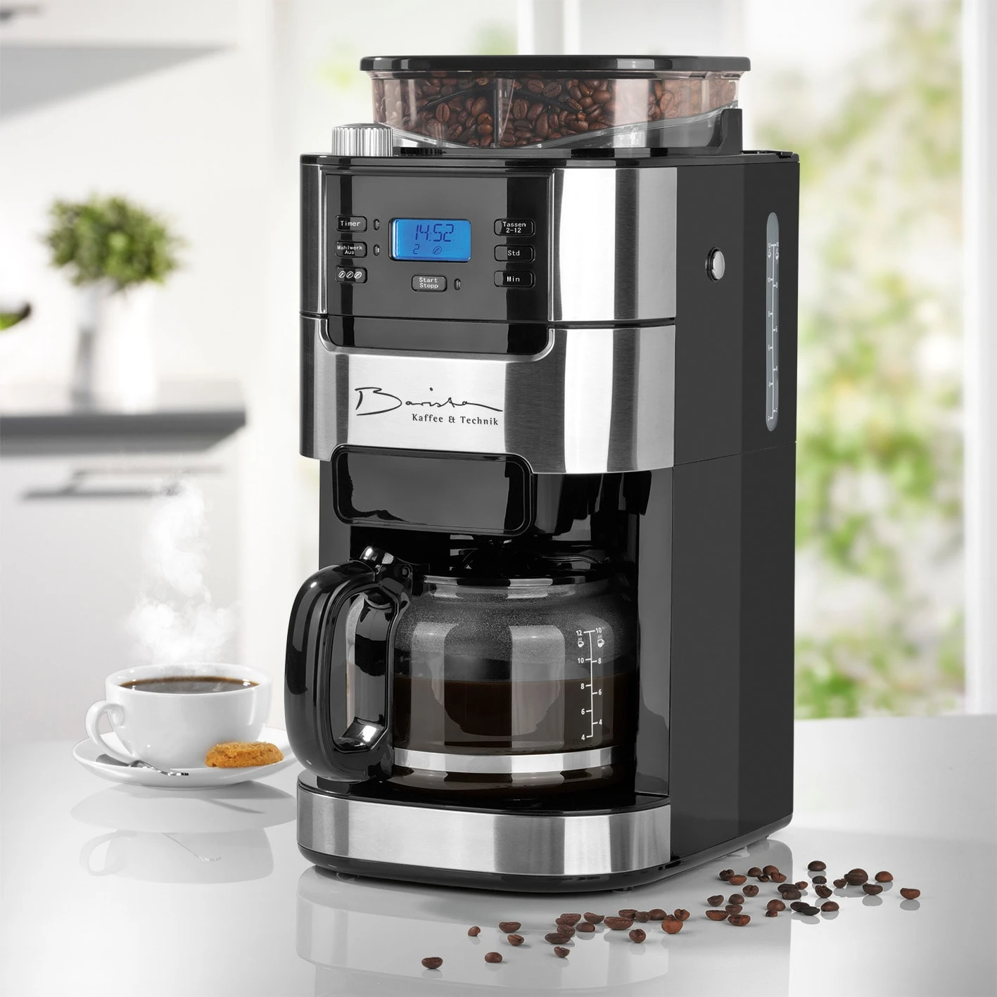 Beginnen Sie ab sofort jeden Tag mit dem unvergleichlichen Duft von frisch gebrühtem Kaffee! Mit der „Barista“ Kaffeemaschine müssen Sie nicht mehr länger auf Ihren Kaffee warten, sondern können ihn dank 24-Stunden-Timer schon am Vorabend ganz bequem „in Auftrag geben“. Die Maschine startet dann automatisch zur Wunschzeit mit der Zubereitung. Genießen Sie besonders aromatischen Kaffee aus ganzen Bohnen, denn das integrierte Mahlwerk mahlt den Kaffee immer ganz frisch. Mit dem waschbaren Permanentfilter haben Sie immer den passenden Filter zur Hand und müssen nicht mehr auf Ihren frischen Filterkaffee verzichten. Dank der Warmhalteplatte darf der Kaffeegenuss auch etwas länger dauern. Das ist moderner Kaffeegenuss in Bestform!