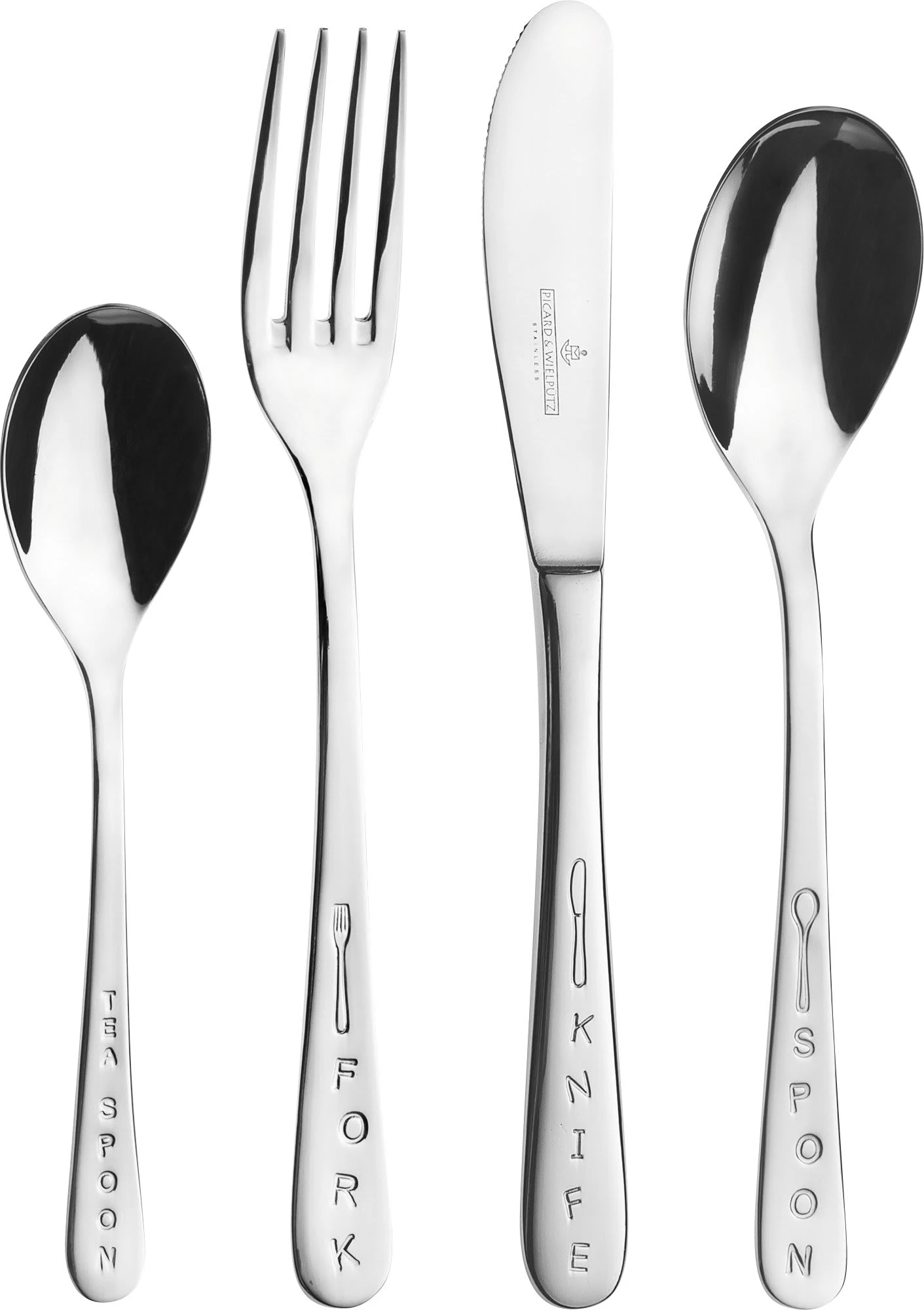 Picard & Wielpütz Kinderbesteck „Kids“ 4-teilig. Mit diesem Kinderbesteck macht den Kids das Essen richtig Spaß. Der besondere Effekt wird durch die englische Bezeichnug auf jedem Besteckteil erzielt. Bestehend aus Messer, Gabel, Löffel und Dessertlöffel. Aus Chrom-Nickel-Edelstahl 18/10. Spülmaschinenfest und rostfrei.