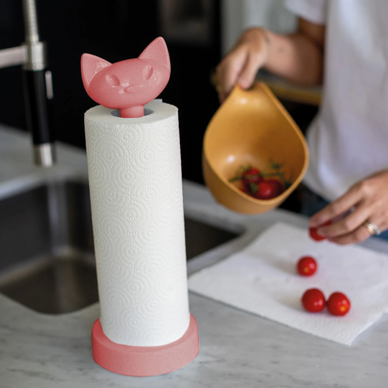 Mit MIAOU gibt sich die Küchenrolle rank und schlank – für mehr wertvollen Platz auf der Arbeitsplatte. Der Katzenkopf hat mit viel Cleverness jede Kleckerei im Blick und lässt sich zum Wechsel der Papiertücher ganz geschmeidig entfernen. Trotzdem steht das talentierte Team kippelfest auf einem breiten Sockel. Daher bleibt MIAOU auch inmitten lebhafter familiärer Tischrunden ebenso standhaft wie dekorativ. Passend für alle Standard-Küchenrollen bis 26 cm Breite. •zum Rollenwechsel einfach Kopf abziehen•mit Abrollstopp •platzsparend•ideal für kleine Küchen•origineller Hingucker•100% CO2-neutral ORGANIC BIO-CIRCULAR