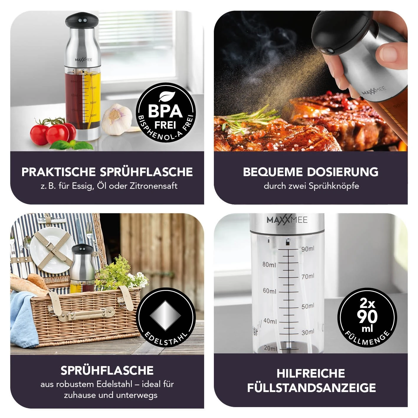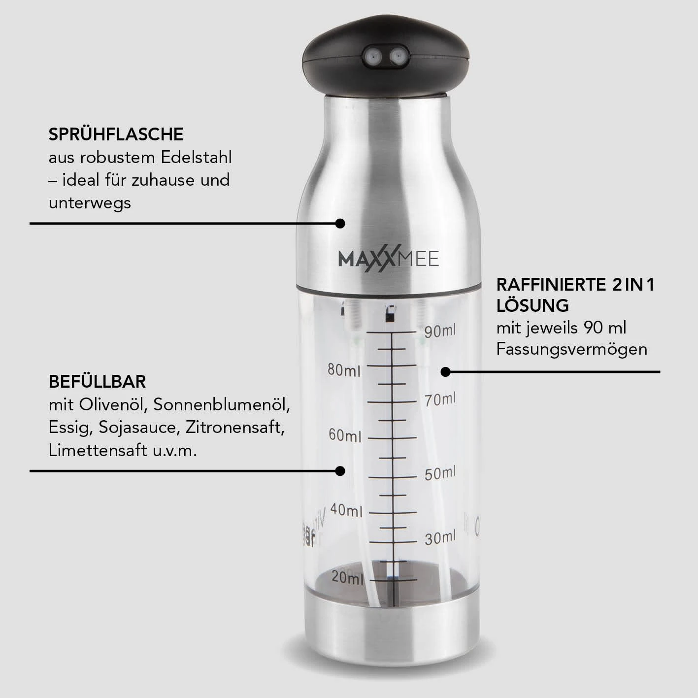 Grandios nicht nur für Salatfans: Mit der raffinierten MAXXMEE Sprühflasche kannst du Essig und Öl jederzeit sauber und genau so stark oder dezent dosieren, wie es dir gerade schmeckt. Außerdem hast du nun jederzeit beides griffbereit und musst nie wieder nach dem Essig suchen, während du das Öl schon benutzt hast.
