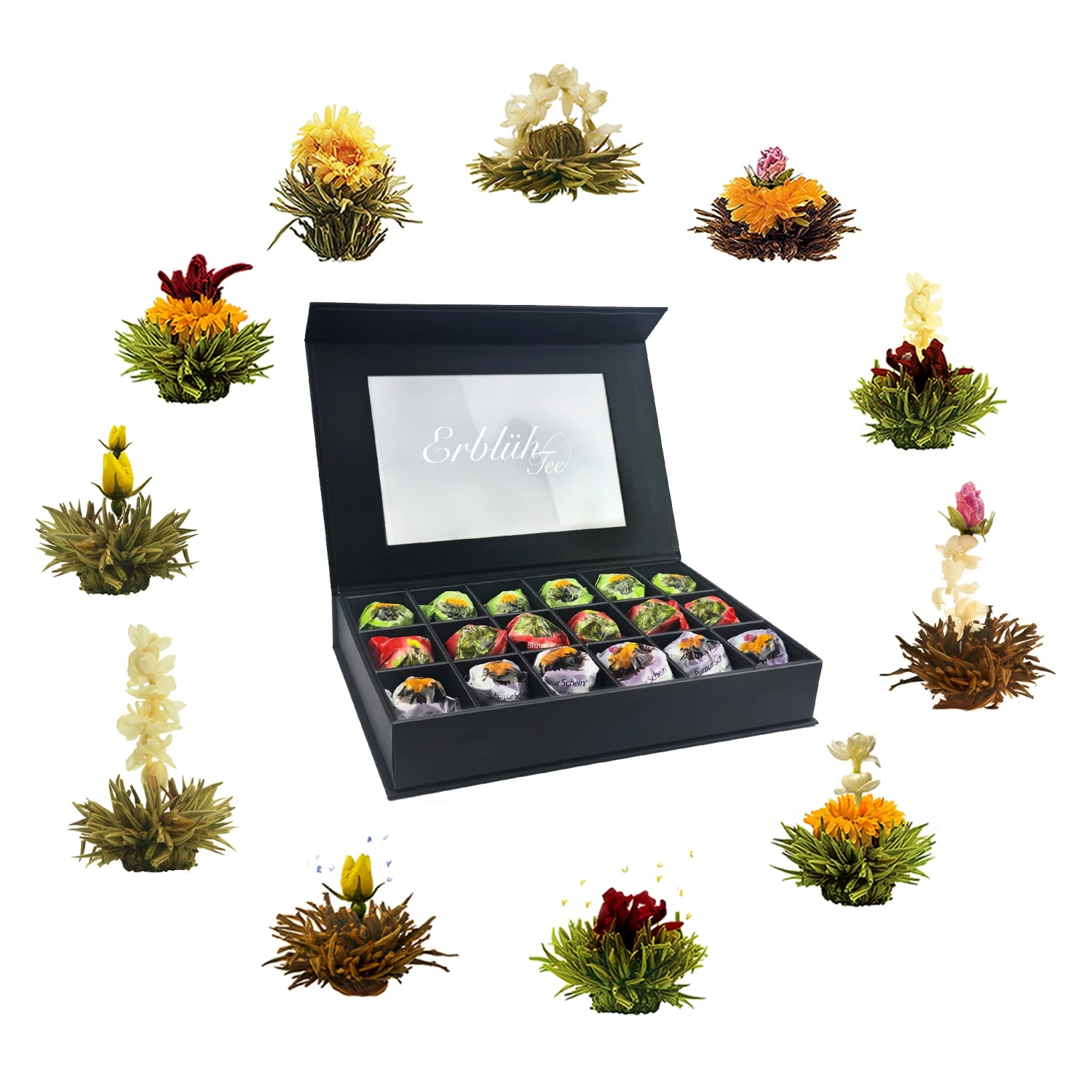 Der ErblühTee bietet dem Genießenden ein außergewöhnliches Erlebnis: Im Innern der Kugel befindet sich eine kunstvoll eingebundene exotische Blüte. Ihr Geheimnis entfaltet die Kugel aber erst, wenn sie in ein Gefäß mit kochend heißem Wasser gegeben wird. Sie beginnt sich langsam zu öffnen und bringt am Ende der Aufgussinszenierung die eingebettete Blüte hervor, die formenreich und farbenprächtig aus ihr emporsteigt. An diesem Tee ist fast alles Handarbeit. Nur wenigen so genannten Meisterbinderinnen ist es vorbehalten, die getrockneten Blätter des Weißen Tees zu einer Kugelform zu binden, denn das Wissen um diese seltene Kunst wird streng behütet. So bleibt der ErblühTee eine wertvolle Rarität Chinas.