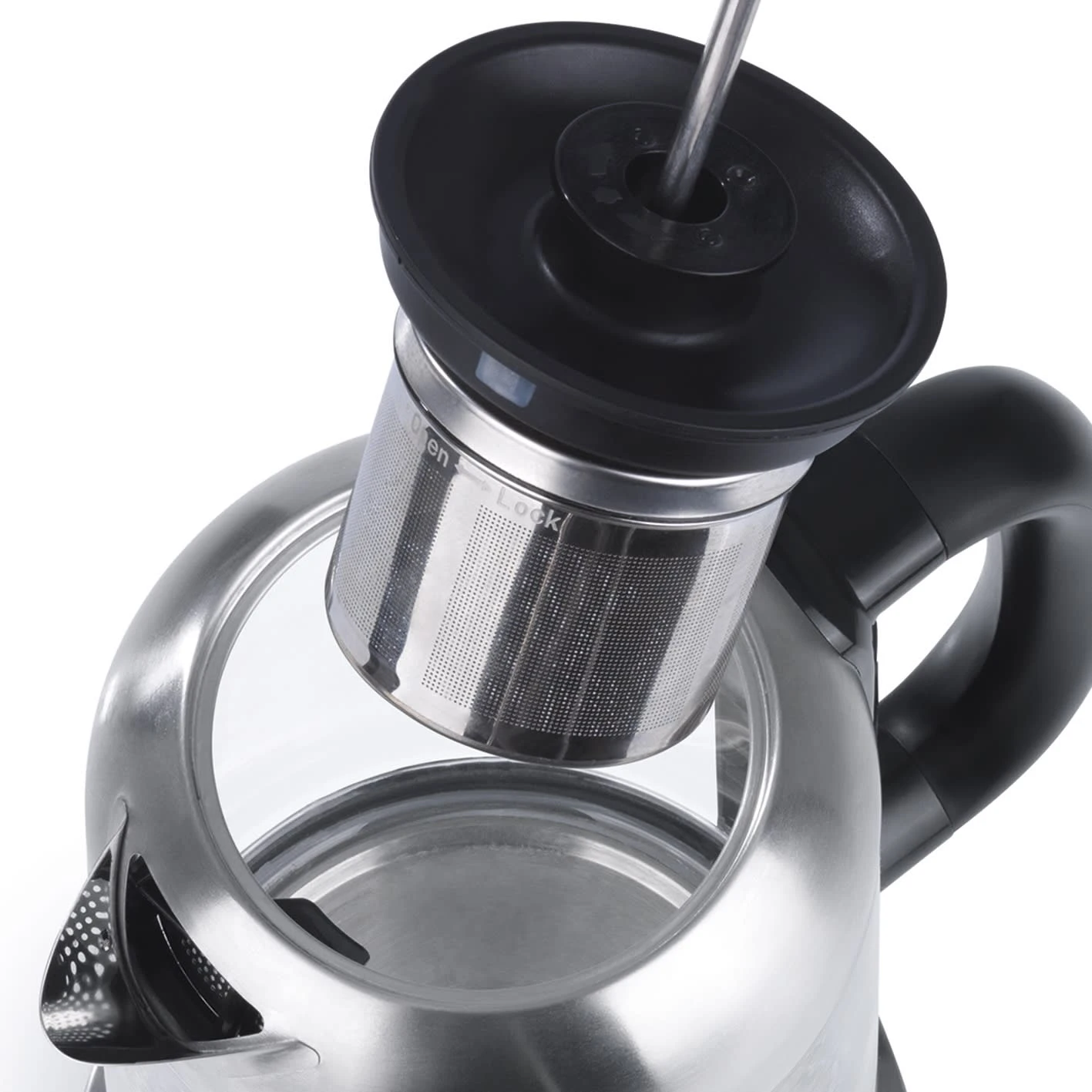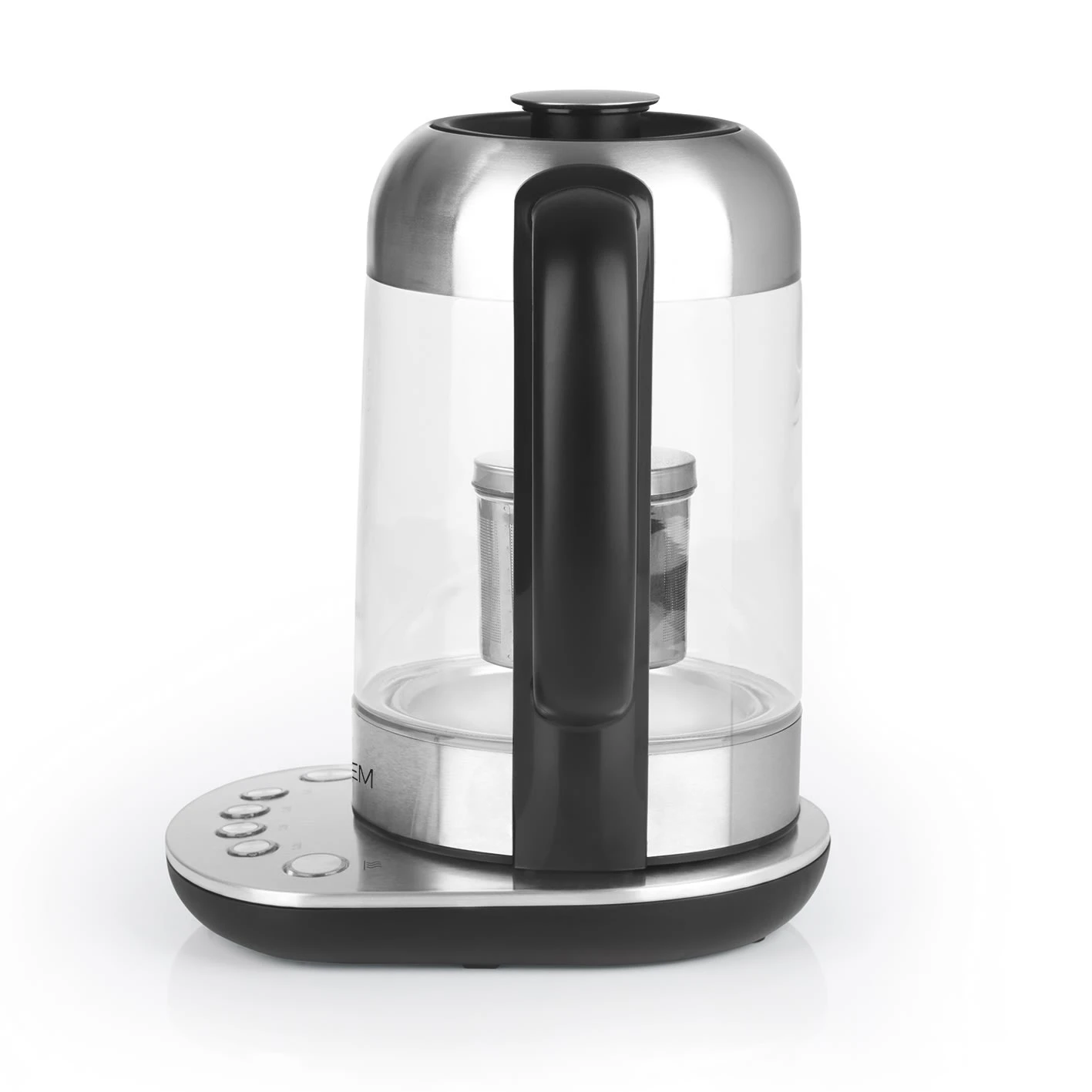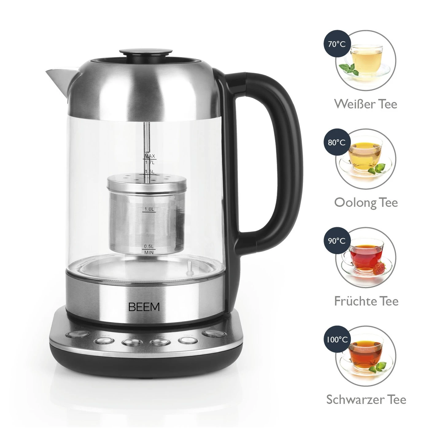Dieser Wasserkocher besticht nicht nur mit einer hochwertigen Optik – er bietet auch eine Menge zeitgemäßen Bedienkomfort für den modernen Teetrinker: Mit der vierstufigen Temperaturauswahl bereitest du das Wasser auf Knopfdruck für nahezu jede Teesorte optimal temperiert zu. 70 °C eignet sich ideal für sehr empfindliche Teesorten, wie z.B. weißen Tee oder grünen Tee, 80 °C für Oolong Tee, 90 °C für Früchtetee und 100 °C ist die beste Temperaturstufe für schwarzen Tee, Kräutertee oder einfach nur kochendes Wasser. Dank der Warmhaltefunktion, die nach etwa 60 min abschaltet darf die gemütliche Teerunde auch gern mal etwas länger dauern. Damit nicht genug – mit dem integrierten Edelstahl-Sieb inklusive Deckel kannst du deinen Lieblingstee direkt im Wasserkocher zubereiten. Das moderne Design macht ihn zudem zu einem echten Eyecatcher in jedem Ambiente!